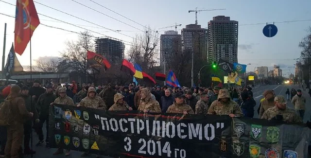 Участники держат в руках плакаты "Постреливаем с 2014-го", а также флаги Украины и политических партий.