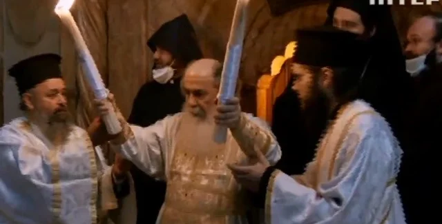 После схождения огня патриарх передал святыню помогающим клирикам, которые зажгли от нее связки из 33 свечей - по возрасту Христа.