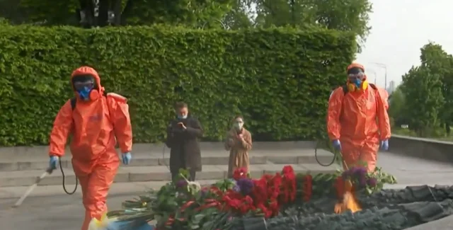 К самому монументу людей пускают по очереди, а территорию возле Вечного огня периодически дезинифицируют. На входе в парк выстроилась небольшая очередь.