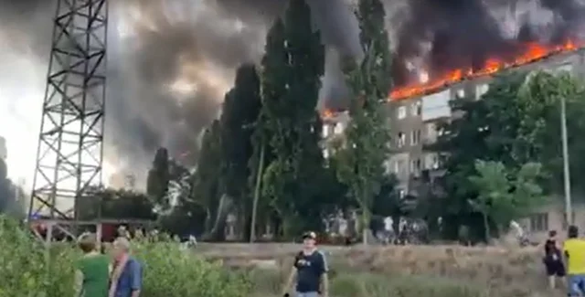 По словам свидетелей, пожар начался в квартире, которую поджег человек, поссорившийся с женой. По данным ГосЧС, огонь охватил 2 тыс. кв. м, крыша здания почти уничтожена.