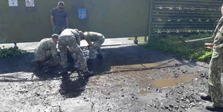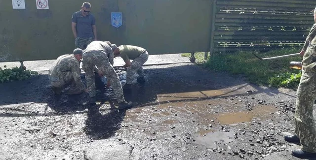 Ремонт проводился на выезде с летного поля на КПП. Вначале солдаты осушили лужи пластиковыми бутылками и самодельными вениками, а потом засыпали гравием и смолой.