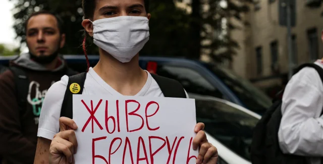 Присутствующие на акции при помощи проектора демонстрируют на установленном там же экране фото протестов из Беларуси. Собравшиеся скандируют "Живе Беларусь".