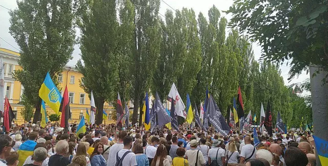 Участники Марша защитников скандируют "Герои не умирают", также некоторые участники скандируют "Донбасс - это Украина". На марше, ветераны АТО говорят, что не согласны с перемирием на Донбассе на условиях, которые принял президент Владимир Зеленский. Из-за этого, некоторые из бойцов собираются сегодня к Офису президента.