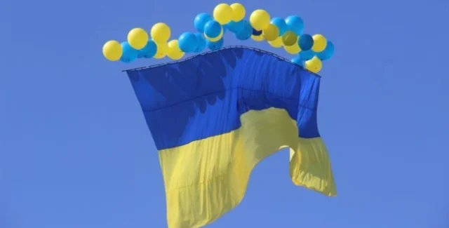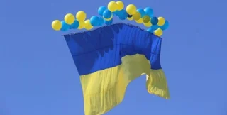 Отмечается, что флаг Украины прикрепили к 50 воздушным шарикам синего и желтого цвета. Также к шарикам прикрепили открытки с поздравлениями.