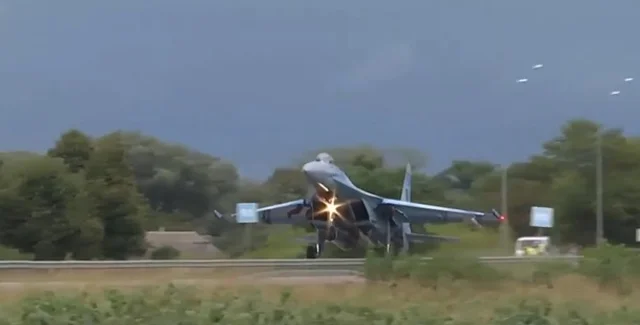 В Ровенской области во время учений истребитель Су-27 в момент приземления снес дорожный автомобильный знак. Соответствующее видео показал телеканал 2+2.