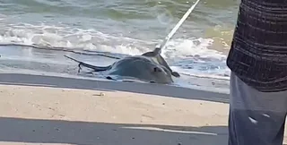 На кадрах можно увидеть электрического ската, который "барахтается" у самого берега, и мужчину, который старается поддеть его багром, по всей видимости, опасаясь разряда тока. Рядом несколько мужчин с удочками и другими рыболовными снастями пытаются отодвинуть ската подальше от воды.