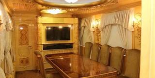 Такой вагон вмещает до 11 человек, имеет кухню с холодильником, зал отдыха с компьютером и видеотехникой, а также кровать и ванную комнату, сообщили в "УЗ" в ответ на запрос УНН. Внешне он ничем не отличается от обычного, однако в середине – настоящее барокко: ценное дерево, мозаика и даже позолота.