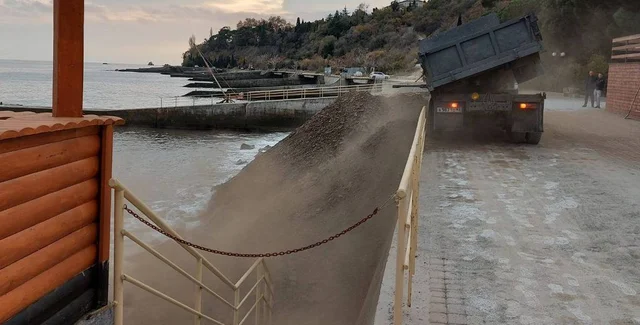 Пляж в поселке Малый Маяк (Алушта) в оккупированном Крыму фактически уничтожили, засыпав землей и строительным мусором из самосвала. Фотографиями произошедшего поделилась пользователь Твиттера.
