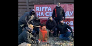На фотографии шестеро активистов организации, вооруженные топором, позируют рядом с забором частного дома, с отделенной от тела свиной головой, лежащей на пне. Один из активистов залил импровизированную "плаху" и топор красной краской, которая, вероятно, должна символизировать кровь.