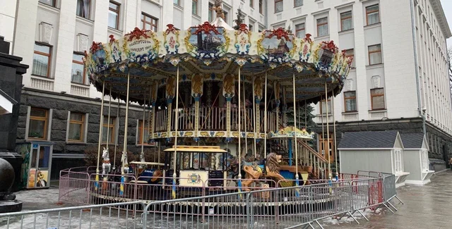 "Похоже, в ОП решили поразить киевлян и гостей столицы масштабом празднования. Огромную карусель установили прямо у входа в здание", – сообщается в репортаже "Телеканала 24".