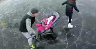 На записи сначала отец девочки катается по озеру на коньках, одной рукой держа коляску с дочкой, а второй – селфи-палку. Затем он снимает, как на коньках катается мама с девочкой в коляске.
