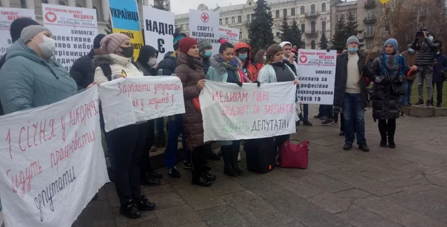 "Уже в этом году зарплата врачей должна была составлять не менее 23 тысяч гривен, для среднего медперсонала – 17 тысяч гривен и для младшего – 12 тысяч. Однако на деле медики получают втрое меньше этого", – сообщается в материале со слов собравшихся. В частности, участники протеста отмечают, что фельдшеры по Украине получают сейчас не более 5 тысяч гривен.
