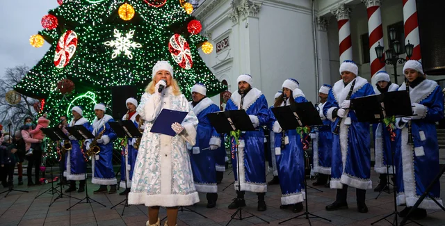 Перед собравшимися жителями Одессы выступил Одесский муниципальный духовой оркестр имени Салика, музыканты которого переоделись по случаю в отряд Дедов Морозов.