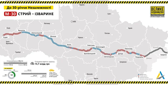 "Мы хотим соединить Западную и Восточную Украину трассой М-30. Название будет к 30-летию Независимости Украины. Часть будущей трассы была восстановлена ​​в этом году. Часть будет восстановлена ​​в следующем году. Это будет самая длинная трасса страны. Несмотря на то, что отдельная часть находится сейчас на временно оккупированной территории. Почти 1400 км. Сейчас сама трасса у нас 900 км", — отметил заместитель руководителя Офиса Президента Кирилл Тимошенко.