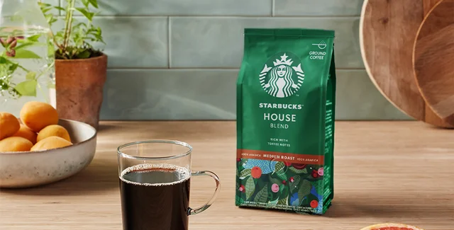 • Молотый кофе Starbucks® House Blend® – бленд отборных зерен кофе из Латинской Америки среднего уровня обжарки.