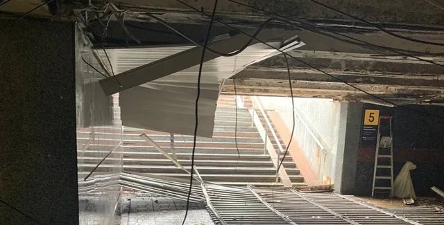 На видео, которое появилось в соцсетях, видно, что полностью обрушилась вся отделка потолка, перекрыв один из выходов на улицу.