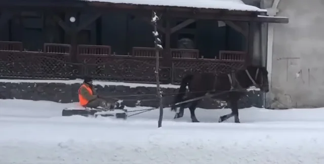 На Львовщине коммунальщик чистил снег с помощью коня (видео)