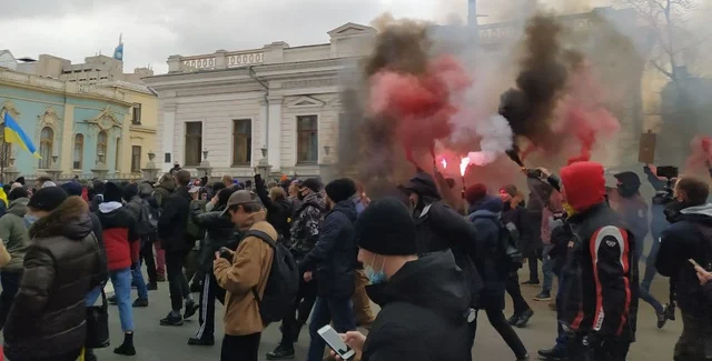 Ранее протестующие митинговали 23 февраля. В 20:00 на улице Банковой в Киеве прошла акция в поддержку бывшего лидера одесского "Правого сектора" Сергея Стерненко, которого Приморский райсуд Одессы приговорил к 7 годам и 3 месяцам заключения за похищение депутата Одесского горсовета. Митингующие хотели пройти к зданию Офиса президента Владимира Зеленского, однако правоохранители перекрыли подходы к нему.