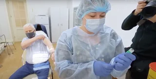 На видео видно, что 87 летний политик сидит в маске на стуле в медицинском учреждении, а медработница делает ему инъекцию и обрабатывает место укола спиртом.