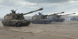 Среди боевых машин бросается в глаза большое количество артиллерийских установок "Мста-С"