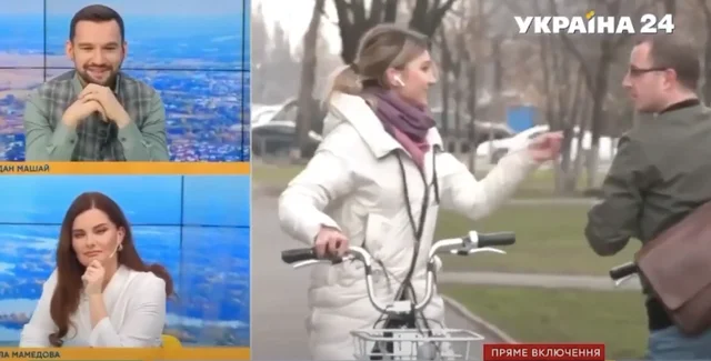 На кадрах видно, что корреспондентка совместно с другими ведущими телеканала обсуждают возможность передвижения по Киеву в условиях ограничения передвижения граждан в общественном транспорте без помощи служб такси. Сама она в кадре также на велосипеде.