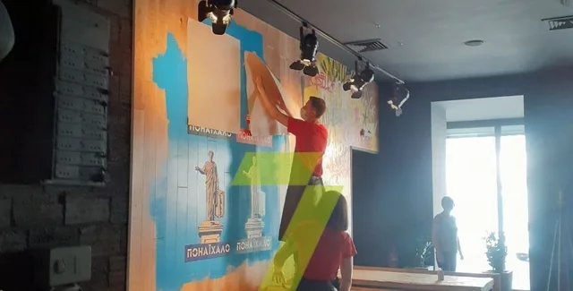 На одном из плакатов, российская императрица Екатерина II стоит у чемоданов, показывая рукой на табличку с надписью "Ростов". На стене за столиками для посетителей есть изображение красного языка, проткнутого гвоздем. Картина подписана словом "Мова".