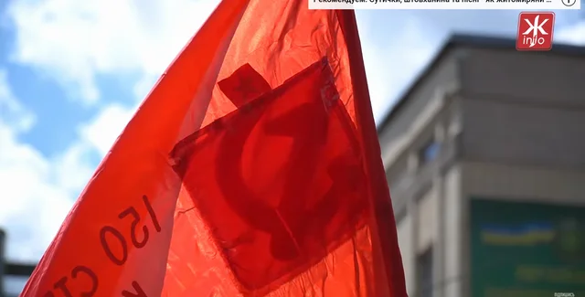 Среди участников шествия некоторые люди пришли с красными знаменами, на которых был заклеен герб СССР в виде серпа и молота. Однако под лучами солнца символы все же просматривались.