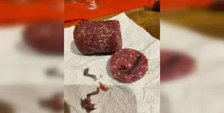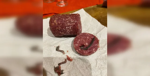 По его словам, колбаса была куплена в одном из магазинов, и изначально все было нормально. Однако при попытке нарезать изделие он и его товарищ обнаружили неприятную находку.