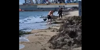 Накануне на побережье в Бердянске море выбросило большое количество водорослей, огромные кучи которых начали гнить и распространять неприятный запах. Коммунальщики прибыли очистить центральный пляж, однако вместо того, чтобы вывезти и утилизировать растения безопасным способом, рабочие принялись при помощи вил сбрасывать их обратно в воду.