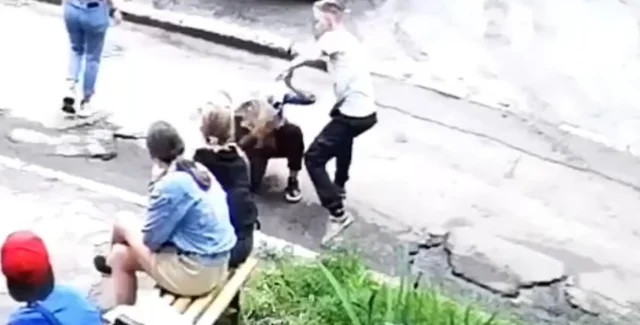 На видео парень бьет девочку руками и ногами, при этом свидетели происшествия лишь наблюдают за происходящим.