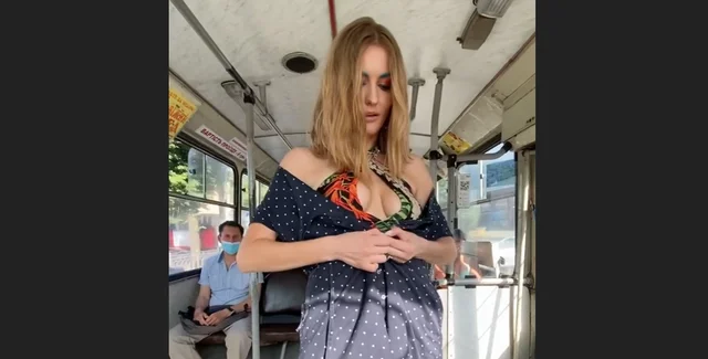 Во время поездки подруга за кадром поинтересовалась у девушки: "Катя, а слабо в тралике раздеться?". Екатерина согласилась и тут же сбросила с себя платье, оставшись в купальнике. В таком виде блогерша продефилировала по задней части троллейбуса.