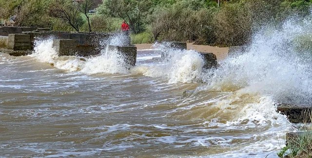 Судя по кадрам, ветер в городе такой силы, что чуть не ломает деревья. На безлюдный пляж обрушились потоки воды.