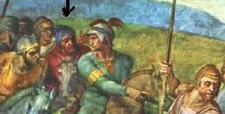 Газета The Independent поясняет, что между двумя конными фигурами у левого края картины виден третий всадник в ярко-синем тюрбане. Это и есть Микеланджело.