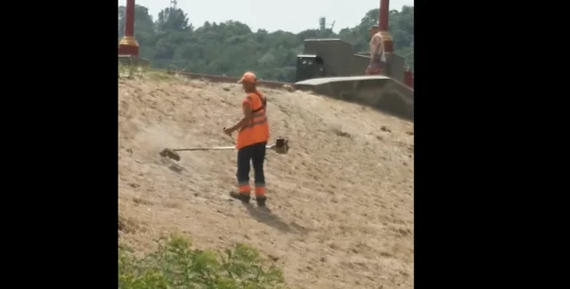 В Facebook Людмила Билека 15 июня разместила видео, снятое возле входа на Пешеходно-велосипедный мост на Трухановом острове в Киеве. На нем работник в оранжевом жилете ходит по песчаному склону и "обрабатывает" его мотокосой.