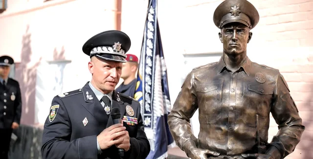 В центре Киева установили памятник действующим полицейским, очень похожий на именинника — начальника областной полиции Андрея Небытова.