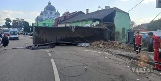 Водитель грузовика не справился с управлением, на большой скорости снес электроопору и влетел в продуктовый магазин.