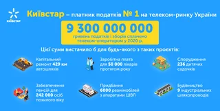 Киевстар, уже являющийся лидером по предоставлению 4G в Украине, победил в рейтинге среди крупных предприятий в сфере информации и телекоммуникаций, перегнав их с заметным отрывом. Только за 2020 год компания пополнила госбюджет на 9,3 млрд грн. налогов и сборов, что на 14% больше в сравнении с предыдущим периодом. Такой суммы достаточно, чтобы обеспечить пенсии 242 000 лиц преклонного возраста или соорудить 236 детских садиков. Кроме налогов в 2020 году телеком-оператор выделил 30 млн грн. для закупки в больницы Украины аппаратов ИВЛ, мониторов жизнедеятельности пациентов, защитных костюмов для медиков и т. п.