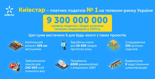 "Что отличает крупный бизнес от малого и среднего? Обороты, масштабы производства и услуг, количество рабочих мест, ведомость… А еще налоги! Киевстар уплатил рекордное количество налогов и сборов в своей отрасли за 2020 год на 9,3 млрд грн". Позиция