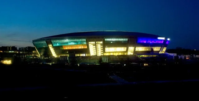 На новом стадионе ФК "Шахтер" в Донецке начался монтаж светодиодных ламп, обеспечивающих подсветку стеклянного фасада. Представители "Донбасс Арены" сравнивают стадион с светящейся летающей тарелкой
