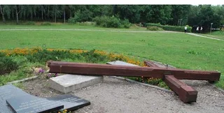 Ночью вандалы разбили мраморную доску и повалили деревянный крест, установленный в 1992 году.