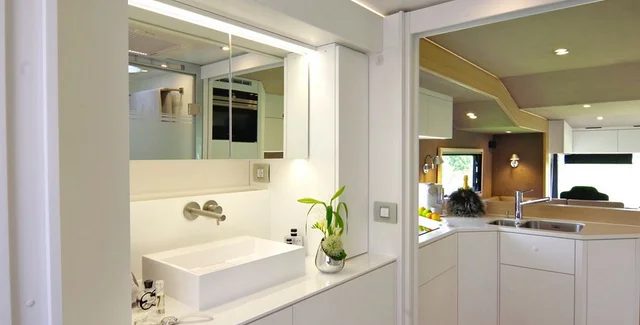 Спот был разработан для промышленного дизайна, сейчас данный светильник по достоинству оценен и в жилом интерьере. В ванной небольшие поворотные споты с направленным лучом работают очень эффективно. Угол и площадь освещения можно поменять в любой момент. Выглядят споты стильно и современно.