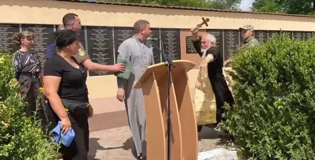 В этот момент одна из женщин в траурной одежде подошла к трибуне и попросила прекратить проповедь, но священник УПЦ, совершавший заупокойную службу, поступил более агрессивно. Размахивая крестом, он нанес телесные повреждения своему коллеге, после чего вмешались присутствующие и разняли церковнослужителей.