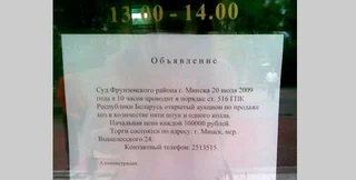 Как сообщает белорусский ресурс "Хартия"97", суд обнародовал объявление следующего содержания: "Суд Фрунзенского района 20 июля 2009 года в 10 часов проводит в порядке ст. 516 ГПК Республики Беларуси открытый аукцион по продаже коз в количестве пяти штук и одного козла. Начальная цена каждой – 100.000 рублей".