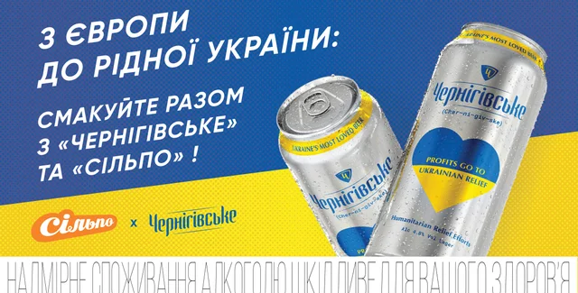 Пивоварна компанія "AB InBev Efes Україна" привезла з Європи пиво "Чернігівське", яке було зварено в різних країнах світу для підтримки України, і запрошує до національної мережі супермаркетів "Сільпо" отримати його за символічну ціну – 0,1 грн, в той час як на інших ринках світу це пиво продається за регулярною ціною. Адже це пиво було зварено спеціально для того, щоб підтримати українців і весь прибуток від продажів "Чернігівське" у світі AB InBev перераховує через Caritas International для підтримки зусиль з надання гуманітарної допомоги в Україні.