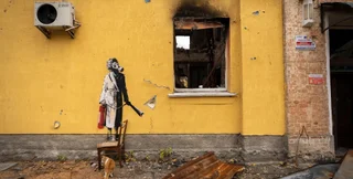 Как пишут местные журналисты, пострадал один из семи рисунков всемирно известного художника-анонима. На стене обгоревшего в результате российских обстрелов здания была изображена женщина в противогазе и с огнетушителем в руках.