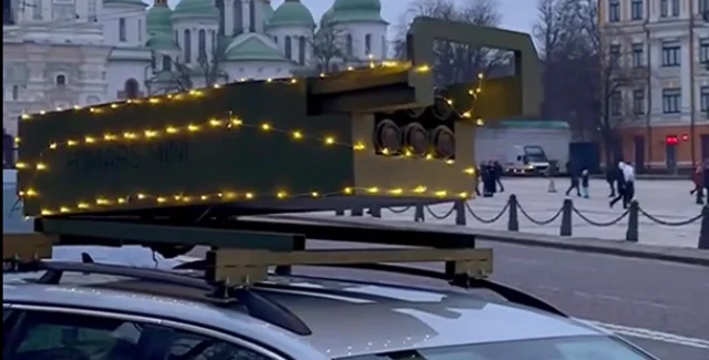 Машину заметили возле Софийской площади, где стоит главная елка страны. Тогда мини-HIMARS был украшен праздничной иллюминацией. Также автомобиль заметили в центре столицы, на заднем стекле его собственники установили флаг Украины. Кроме того, на опубликованных кадрах можно заметить, что самодельная установка может подыматься и опускаться.