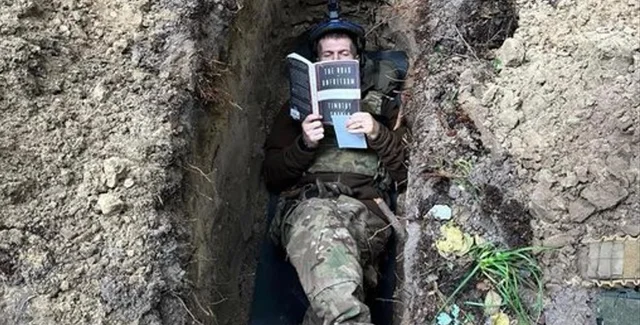 Судя по фотографии боец в окопе читает книгу Снайдера "Дорога к несвободе. Россия, Европа, Америка", которая вышла в 2018 году.