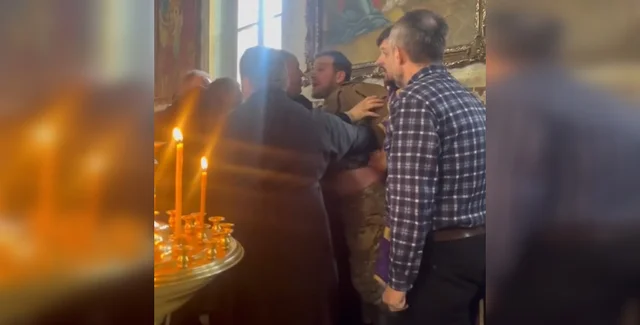 В сети появилось видео, как священники и их помощники заламывают руки военному Артуру Ананьеву и выталкивают его из храма. История неоднозначна — полиция и очевидцы утверждают, что боец устроил в храме провокацию.