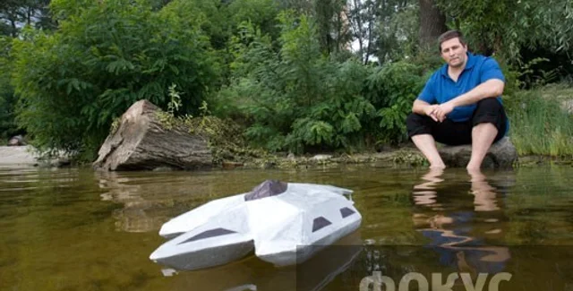 "Видите, он отдаленно напоминает многогранник, – с трепетом демонстрирует свою модель катера-тримарана Александр Березин. За последние несколько лет он впервые показывает эту пенопластовую "игрушку". "У меня уже не раз пытались выкрасть модель и документы", – осторожничает изобретатель.