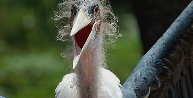 Марабу принадлежит к семейству аистовых. Высота взрослой птицы 1,50 м. Размах крыльев от 2 до 2,50 м. Верхняя часть тела и крылья – черные, нижняя – белая. Голова лысая, с крупным и толстым клювом.